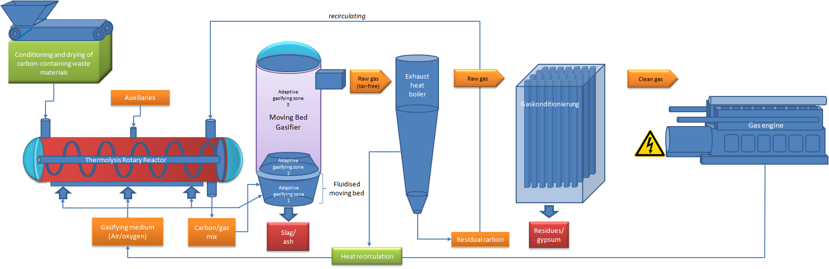 The patent-secured INTEC Technology involves a closed and thus completely emission-free thermal waste treatment primarily consisting of the procedural steps degassing/smouldering (thermolysis) and gasification. The INTEC Thermolytic Cracking Process operates with coupled procedural steps, yet in spatially separated devices. With this system, the respective necessary process parameters can be optimally adjusted, allowing an above-average utilisation by more than 99 % of the energy content of the waste material applied.